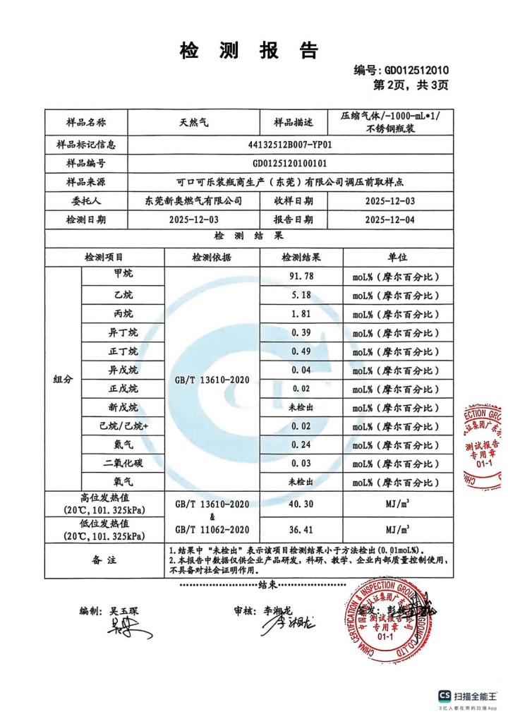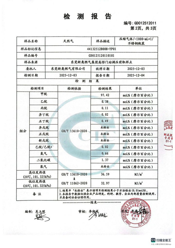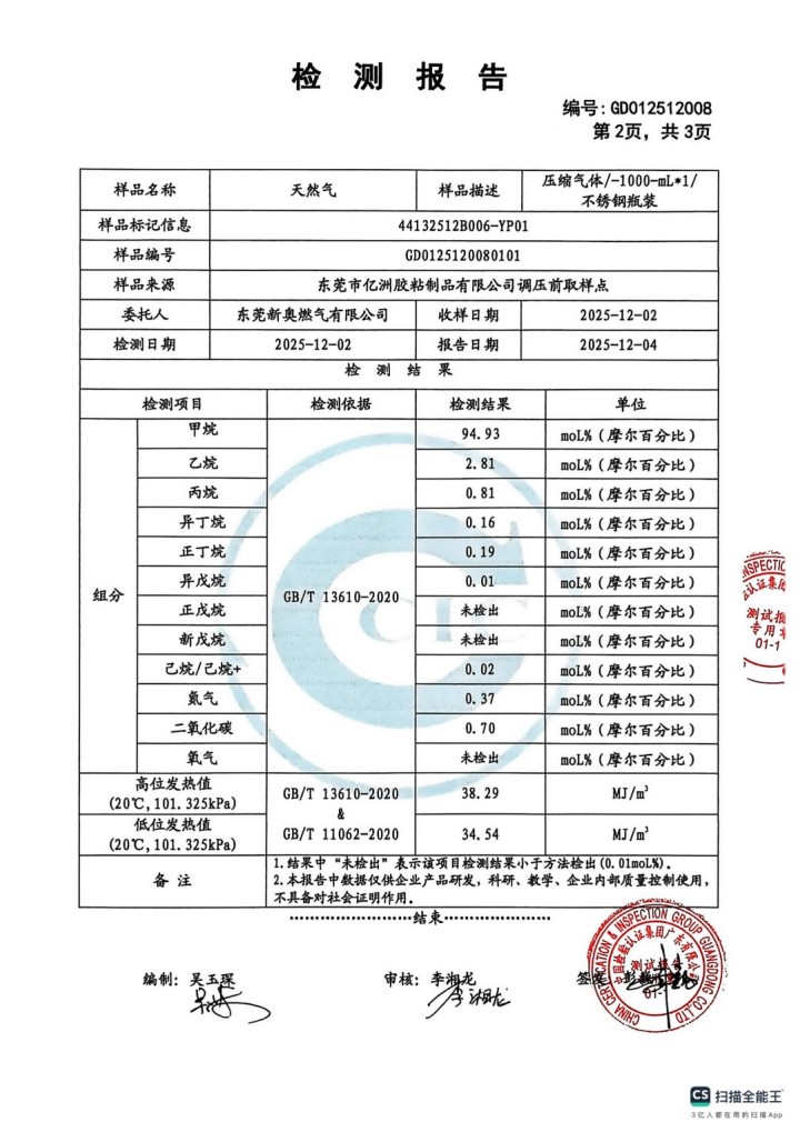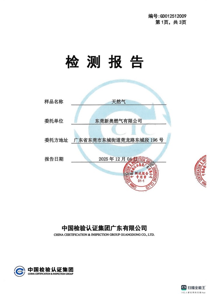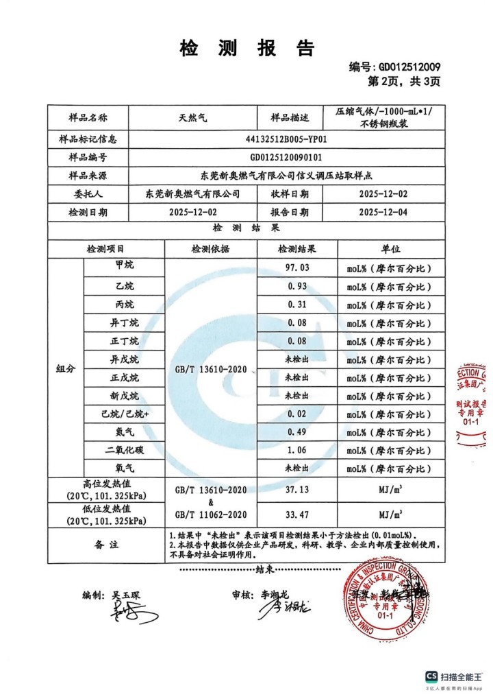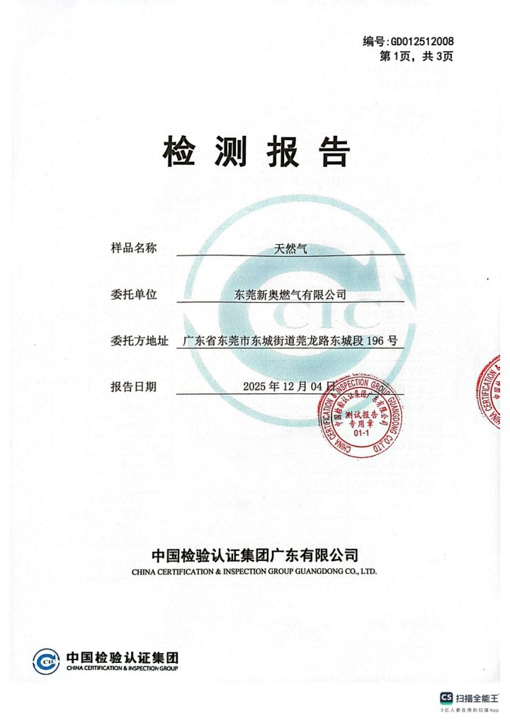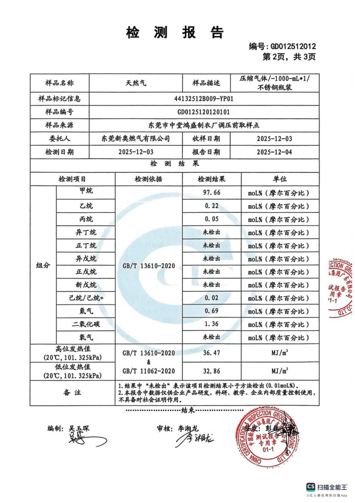東莞新奧2025年12月天然氣氣質(zhì)報告公示