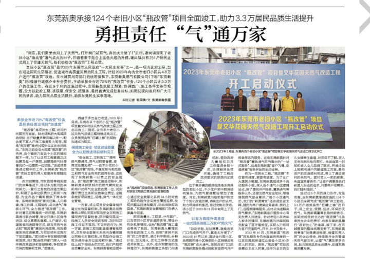 老舊小區(qū)“瓶改管”是2023年東莞市人民政府“十大民生實事”之一,是一項由政府主導(dǎo),旨在增進居民生活福祉、促進城市高質(zhì)量發(fā)展的民生工程,計劃2023年內(nèi)為全市老舊小區(qū)共4.8萬戶進行“瓶改管”改造。在市城管局等部門的統(tǒng)籌指揮下,東莞新奧燃?xì)庥邢薰荆ㄏ路Q“東莞新奧”)積極履行城燃企業(yè)社會責(zé)任,主動承接全市近70%的“瓶改管”任務(wù),124個小區(qū)共計3.3萬戶的改造工作。在近9個月的改造過程中,東莞新奧克服工期緊、協(xié)調(diào)面廣、施工條件復(fù)雜等難題,全力以赴搶工期、抓質(zhì)量、保安全、提服務(wù),最終圓滿完成任務(wù)目標(biāo),如期兌現(xiàn)向政府和廣大市民的承諾,助力居民品質(zhì)生活提升,助推東莞民生實事落地。