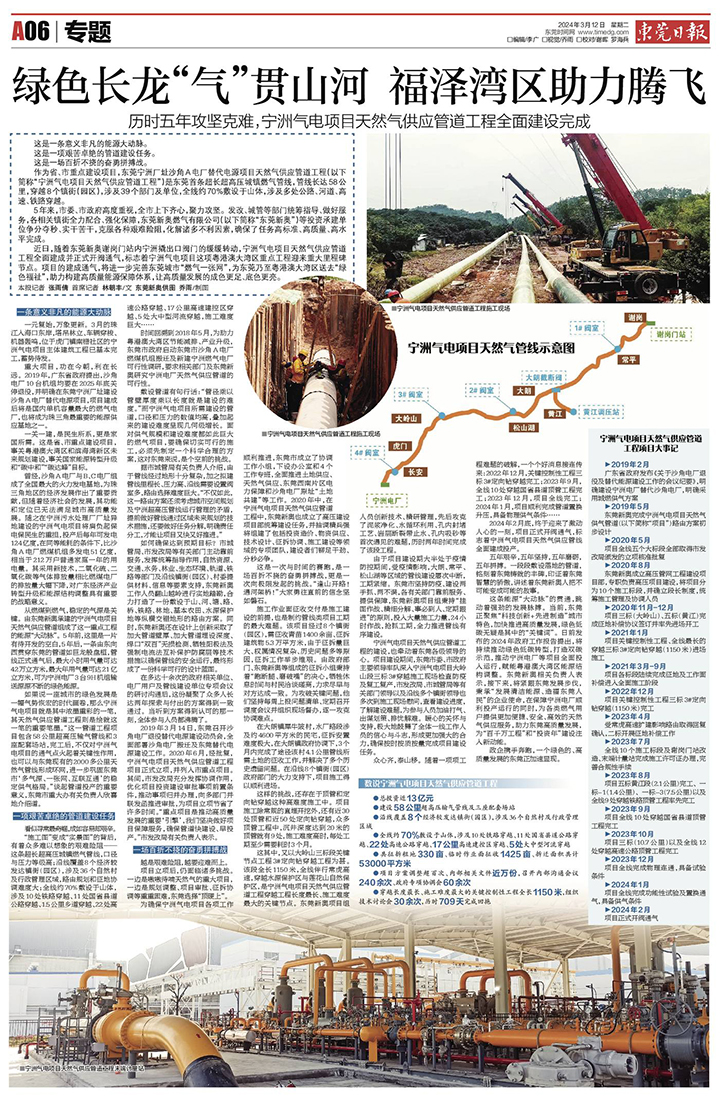 如果說一座城市的綠色發(fā)展是一幅氣勢恢宏的時代畫卷,那么寧洲氣電項(xiàng)目就是其中濃墨重彩的一筆,其天然氣供應(yīng)管道工程則是繪就這一筆的重要筆墨?!斑@一管道工程項(xiàng)目包含58公里超高壓輸氣管線和3座配套場站,完工后,不僅對寧洲氣電項(xiàng)目的通氣點(diǎn)火起著關(guān)鍵性作用,也可以與東莞現(xiàn)有的2000多公里天然氣管線形成環(huán)網(wǎng),進(jìn)一步鞏固東莞市‘多氣源、一張網(wǎng)、互聯(lián)互通’的穩(wěn)定供氣格局?!闭勂鸸艿劳懂a(chǎn)的重要意義,東莞市重大辦有關(guān)負(fù)責(zé)人欣喜地介紹道。