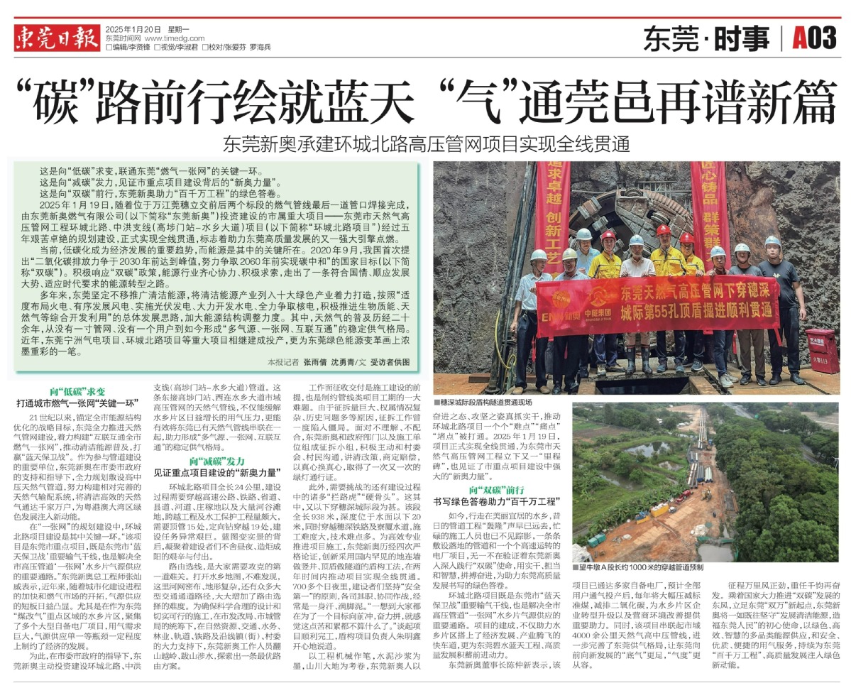 2025年1月19日,隨著位于萬江莞穗立交前后兩個(gè)標(biāo)段的燃?xì)夤芫€最后一道管口焊接完成,由東莞新奧燃?xì)庥邢薰荆ㄒ韵潞喎Q“東莞新奧”)投資建設(shè)的市屬重大項(xiàng)目——東莞市天然氣高壓管網(wǎng)工程環(huán)城北路、中洪支線(高埗門站-水鄉(xiāng)大道)項(xiàng)目(以下簡稱“環(huán)城北路項(xiàng)目”)經(jīng)過五年艱苦卓絕的規(guī)劃建設(shè),正式實(shí)現(xiàn)全線貫通,標(biāo)志著助力東莞高質(zhì)量發(fā)展的又一強(qiáng)大引擎點(diǎn)燃。