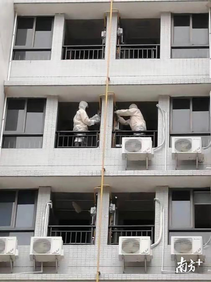 按照往常,32戶的置換通氣工作量大概需要3-4個人用一整天的時間完成。但由于當地急需用到這32個房間作為隔離場所,且用于個人防護的物資也幾乎一套難求。于是,盧森與林榮虎在前一天晚上計劃好輪流作業(yè),以8分鐘一戶的作業(yè)速度,完成每戶的置換通氣工作。